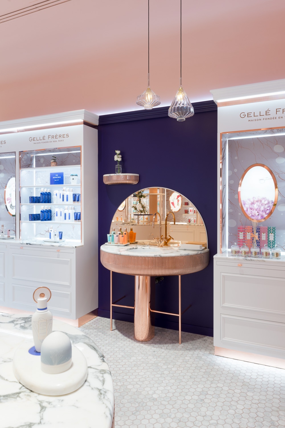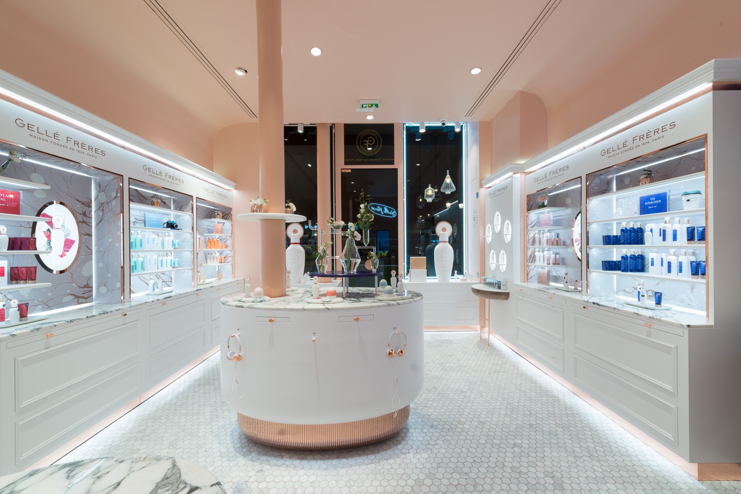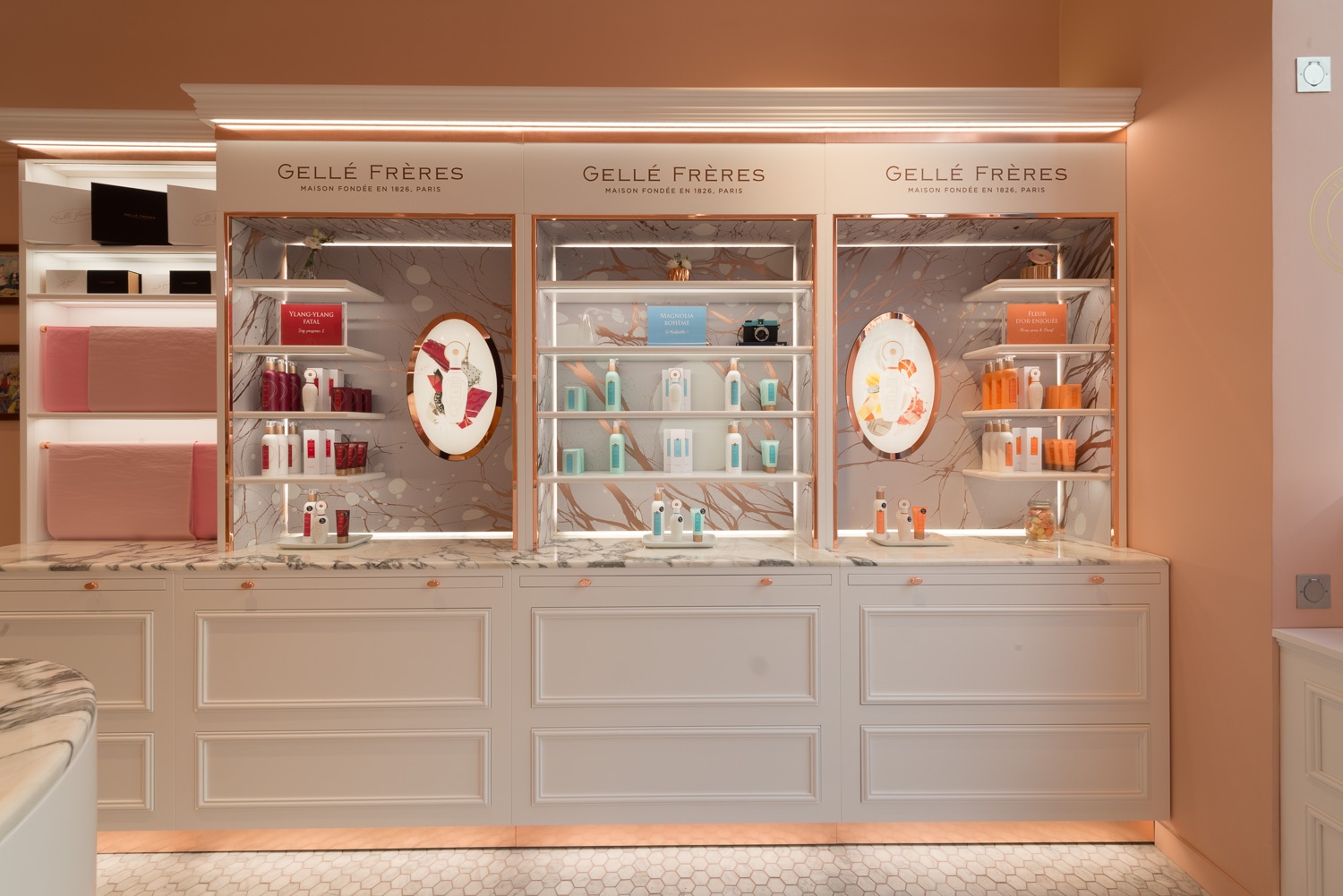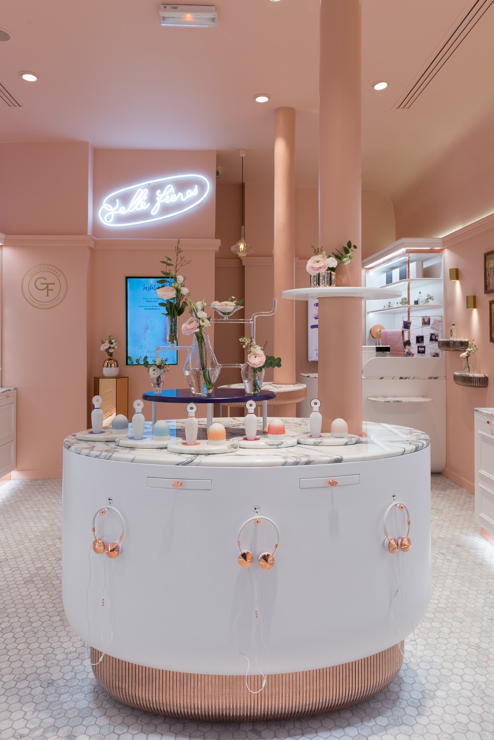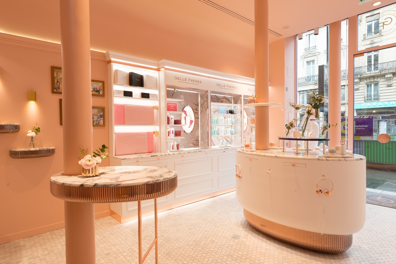 Sina Retail & Image, in partnership with Margaux Keller, had the great opportunity to help the French fragrance brand Gellé Frères open its first store in Avenue de l’Opera, Paris. Parisian elegance, poetry of blossoms and unique femininity of the Queen: the soul of Gellé Frères is revived with a contemporary authenticity in a boudoir with a warm and elegant design.